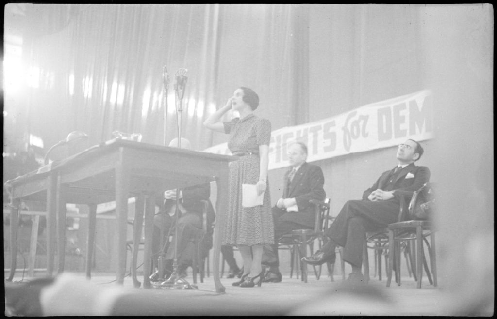 Nous voyons madame Tony Sender prenant la parole lors d'un ralliement organisé par une ligue germano-canadienne anti-nazie. Ce ralliement a eu lieu au Forum de Montréal