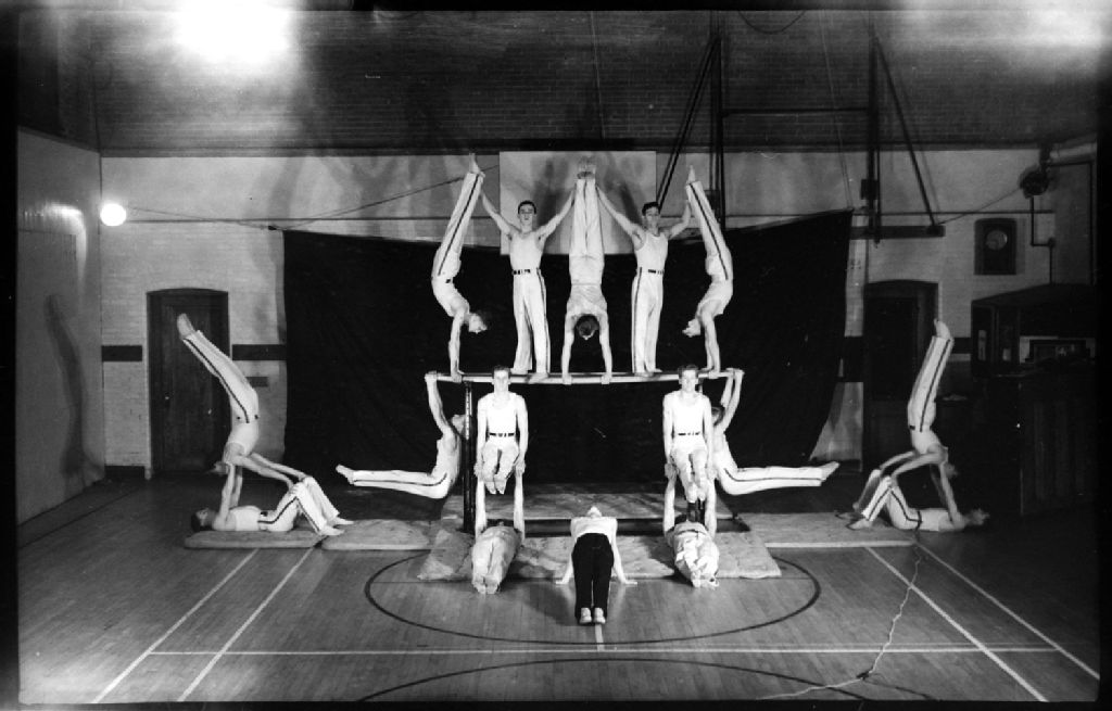 Nous voyons un groupe de gymnastes faisant des exercices d'équilibre sur des tapis et sur des barres parallèles dans le gymnase du «Westmount Y.M.C.A.» à Westmount