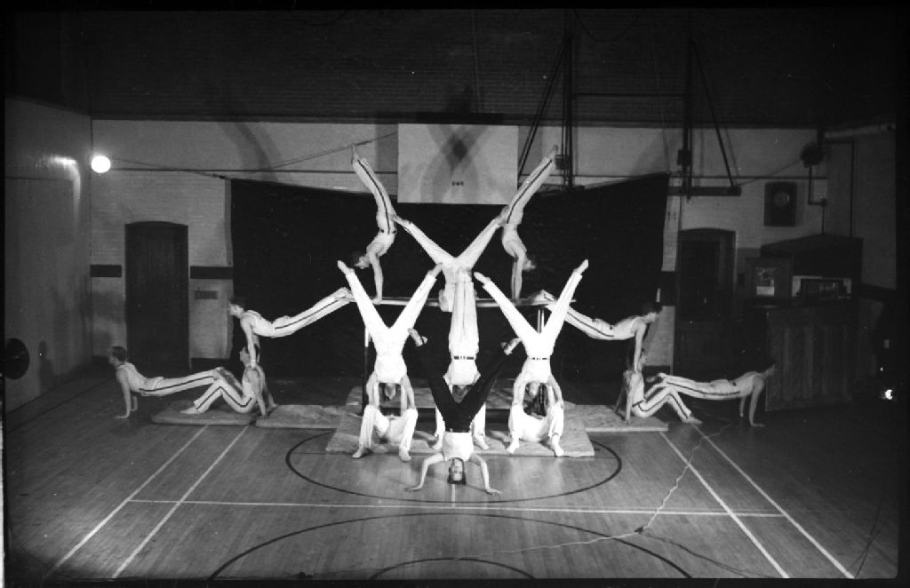 Nous voyons un groupe de gymnastes exécutant une pyramide sur des tapis et sur des barres parallèles dans le gymnase du «Westmount Y.M.C.A.» à Westmount