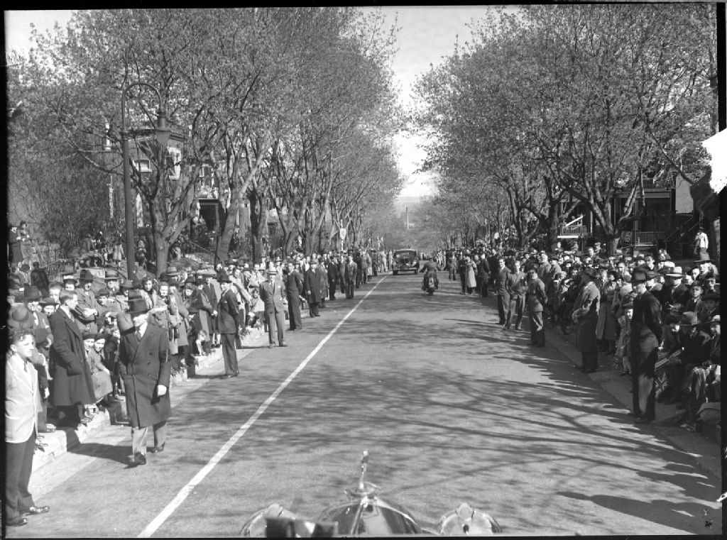 Lors de la visite du couple royal, de nombreux citoyens font une haie d'honneur à la limousine du roi George VI et de la reine Elizabeth, passant dans une rue de Westmount