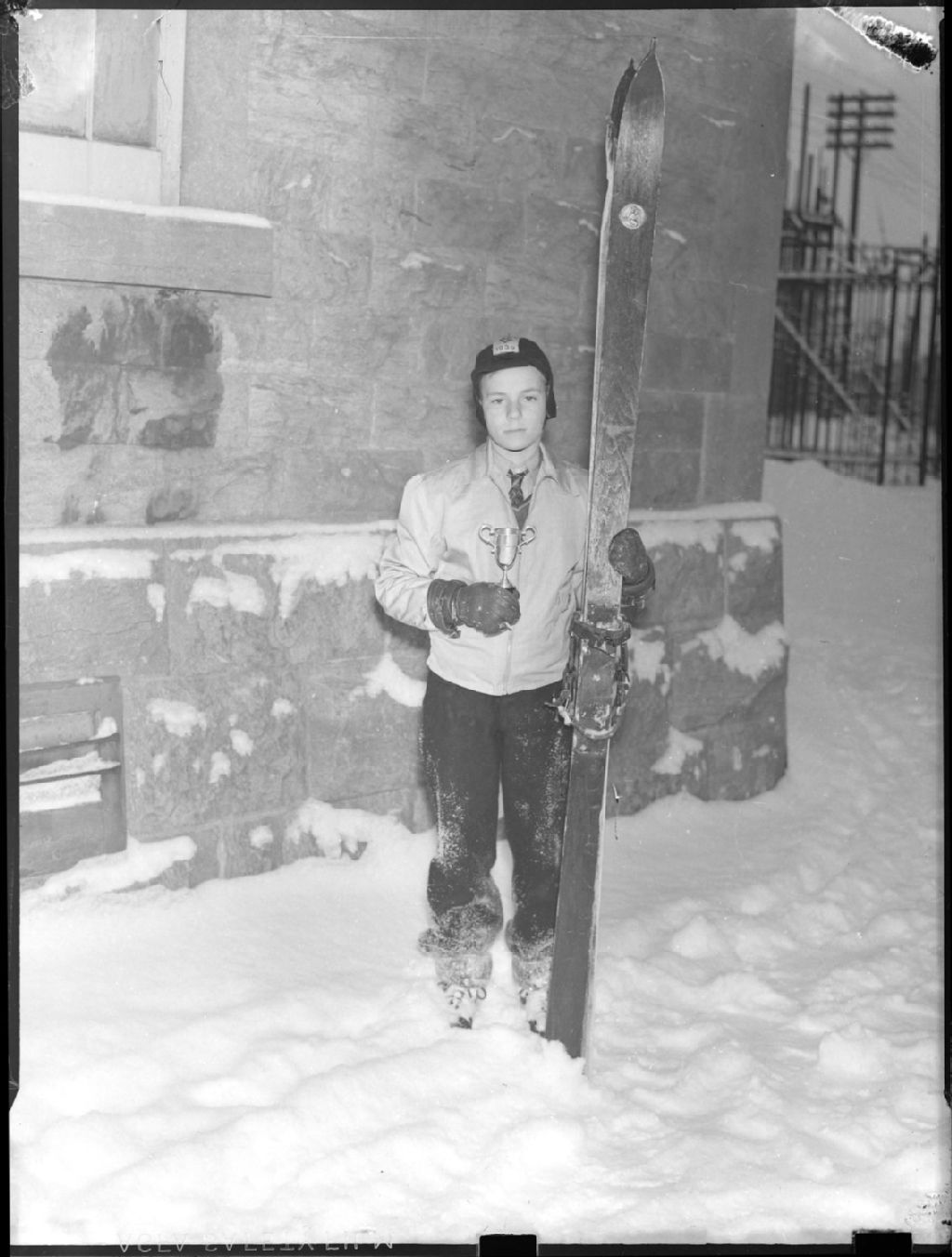 Nous voyons un skieur, Marcel Dupré, debout dans la neige. Il tient d'une main ses skis de fond et de l'autre un trophée