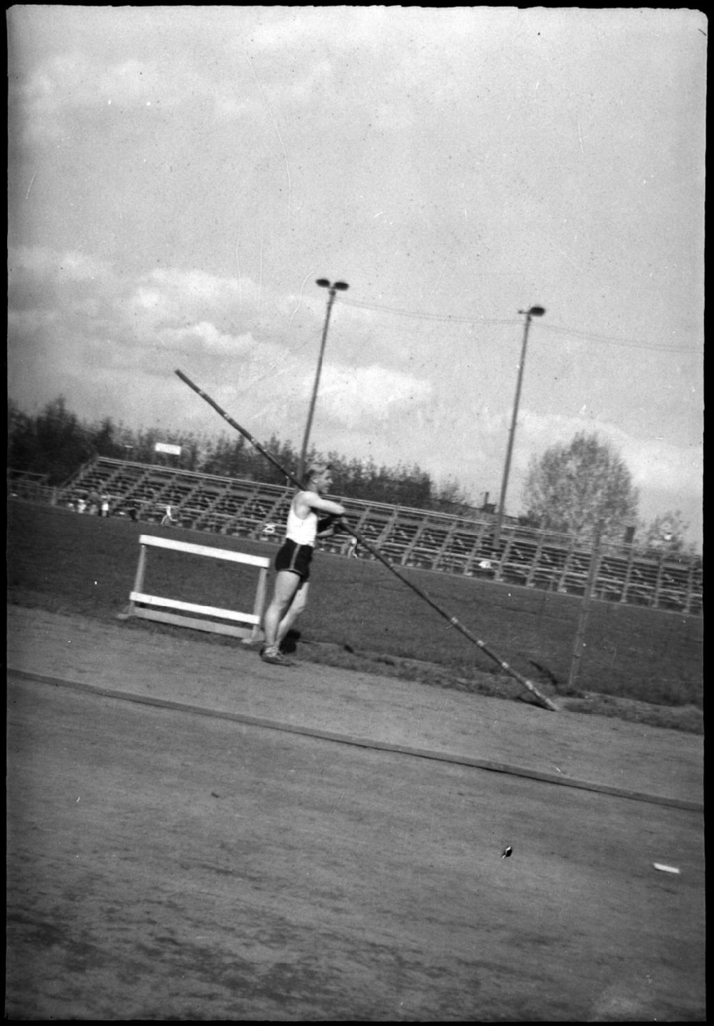 Au Stade Percival Molson de l'Université McGill à Montréal, un homme se prépare à exécuter un saut à la perche. Il tient dans ses mains la perche
