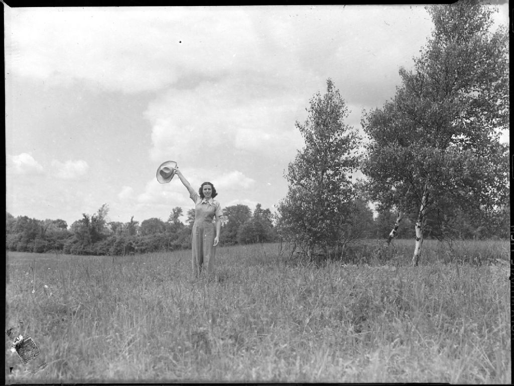 Une jeune fille, Eileen Greenwood, salue avec son chapeau de paille. Elle est debout au milieu d'un champ