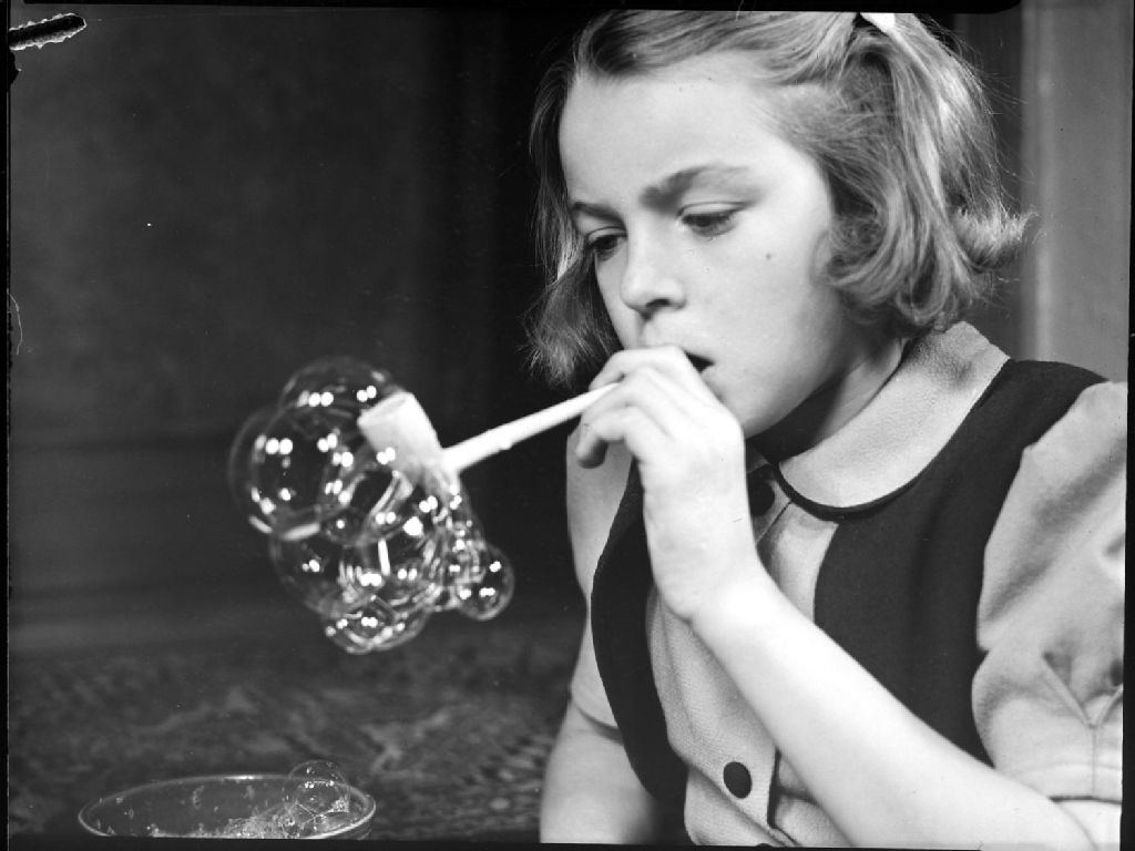 Une fillette, Pauline Luck, fait des bulles de savon avec une pipe