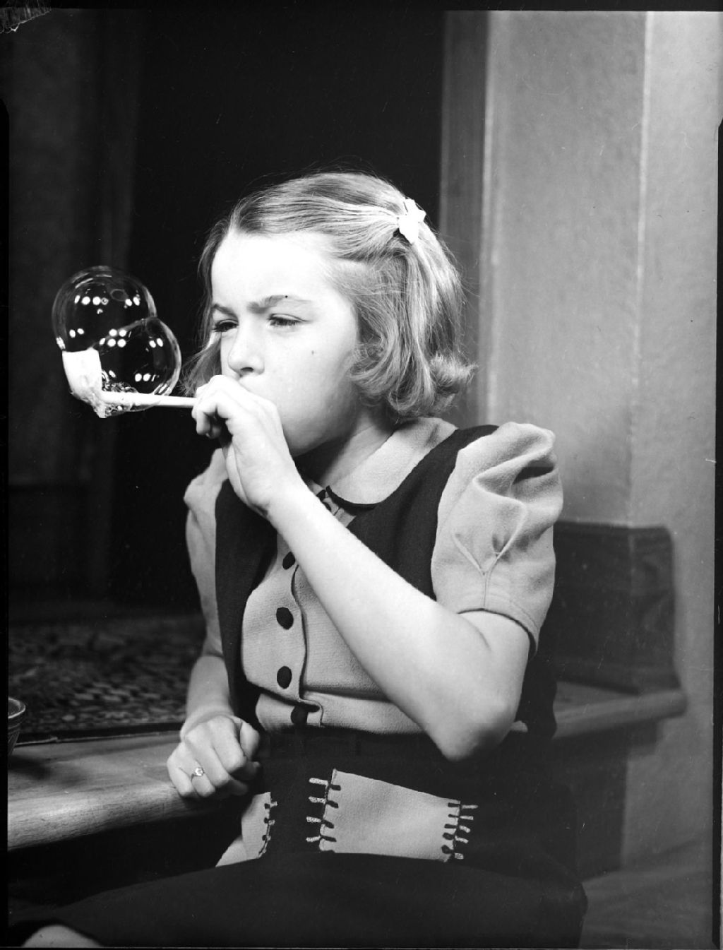 Une fillette, Pauline Luck, accoudée à une table, fait des bulles de savon avec une pipe
