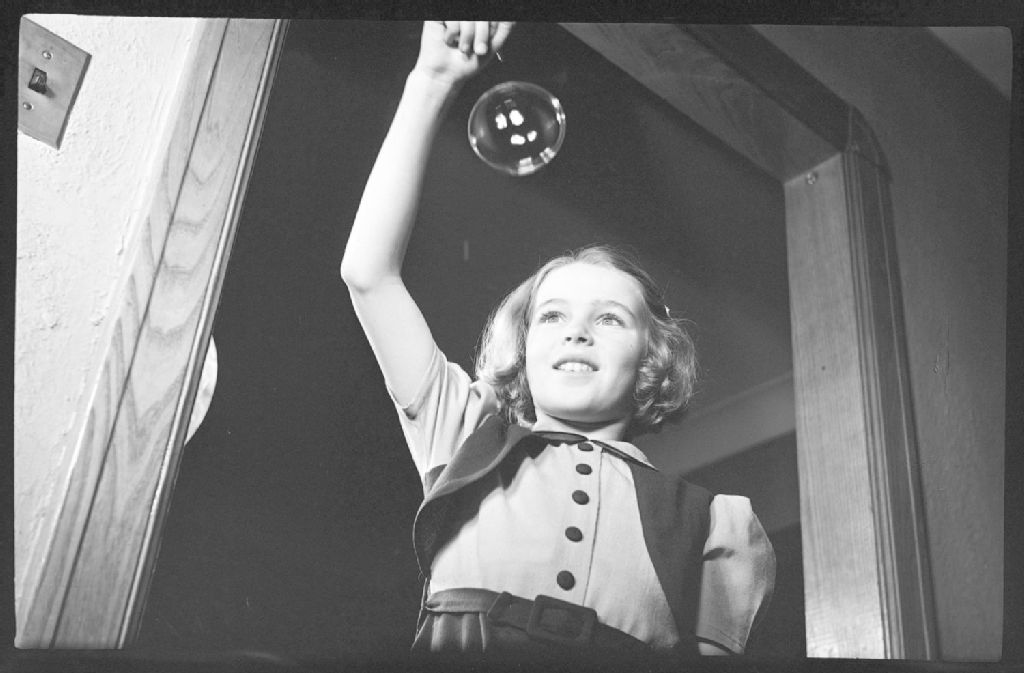 Une fillette, Pauline Luck, fait des bulles de savon avec une pipe