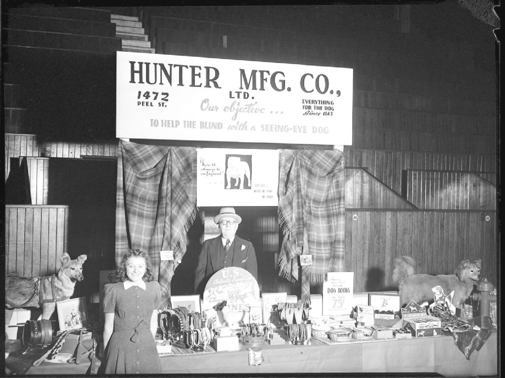 Stand d'accessoires pour chiens où est vendue la marchandise du magasin «Hunter Mfg. Co., Ltd.», situé au 1472, rue Peel à Montréal