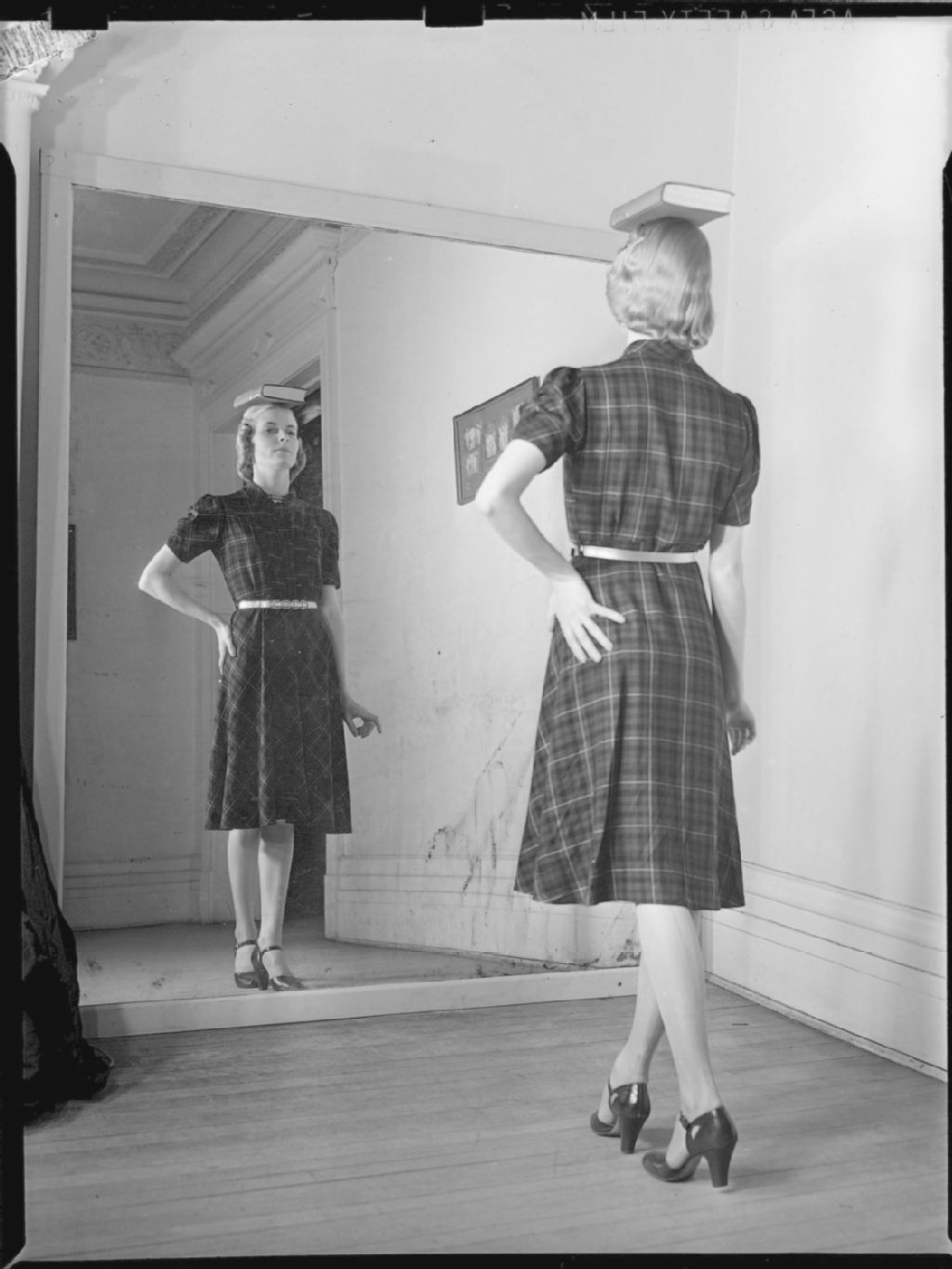 Un mannequin marche devant le miroir avec un livre en équilibre sur la tête à la «Ritz Mannequin School»