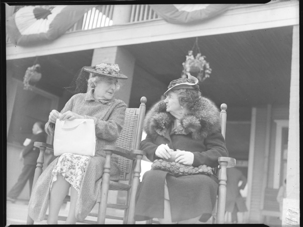 Madame E.W. Bury converse avec une amie à l'hippodrome Blue Bonnets de Montréal