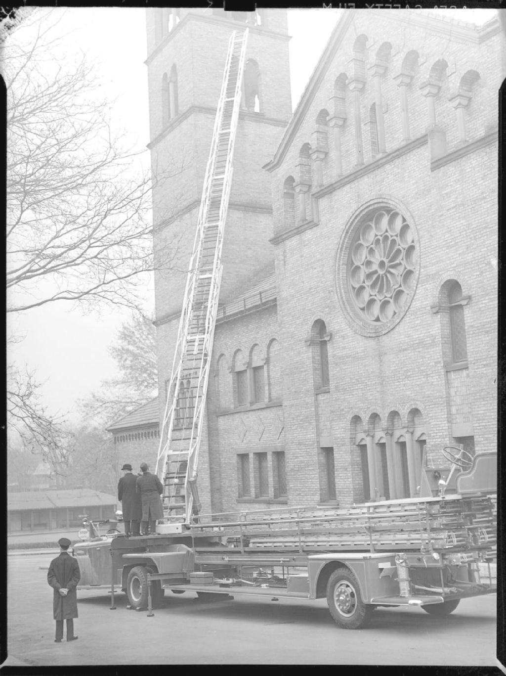 Nous voyons le nouveau véhicule d'incendie de Westmount. La grande échelle est appuyée sur le toit d'une église