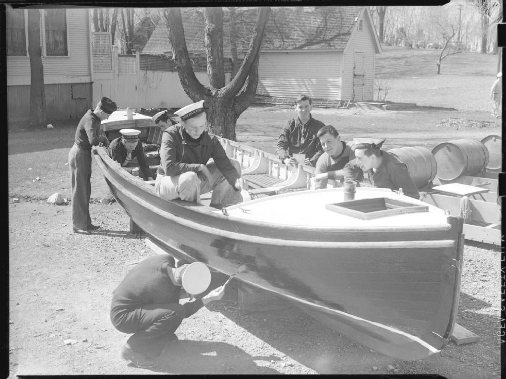 Les «Rover Sea Scouts», des cadets de la marine, peignent et vernissent un voilier en prévision de la saison de régates du «Royal St. Lawrence»