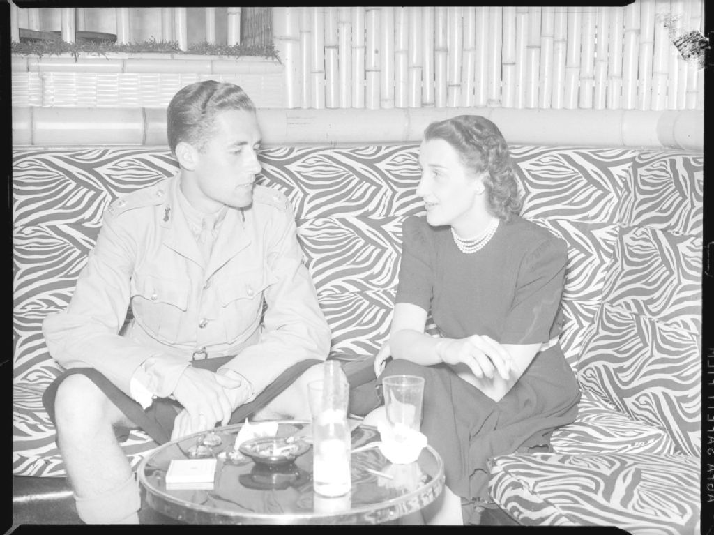 Un militaire et une jeune femme sont assis sur un canapé et prennent un verre au «Tic Toc Club» situé au 1258, rue Stanley à Montréal