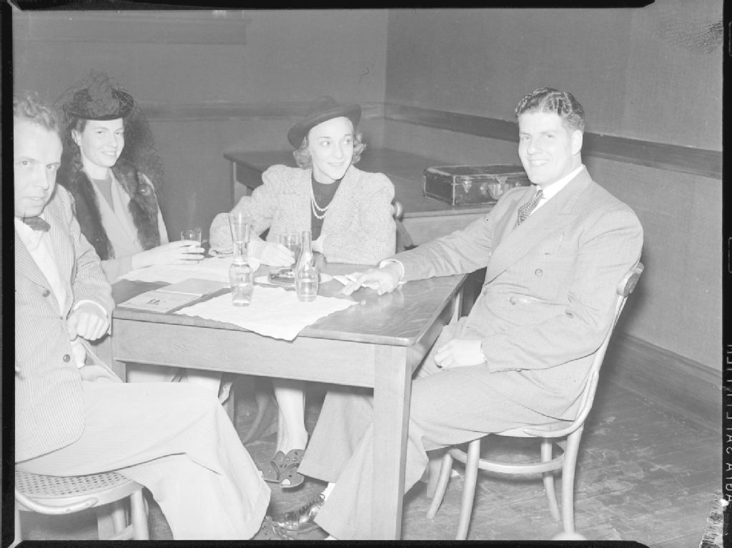 Graham Stanyon, Barbara Knowlton, Helen Mitchell et Robert Mayer prennent un verre à une table de l'hippodrome «Blue Bonnets» situé au 7440, boulevard Décarie à Montréal