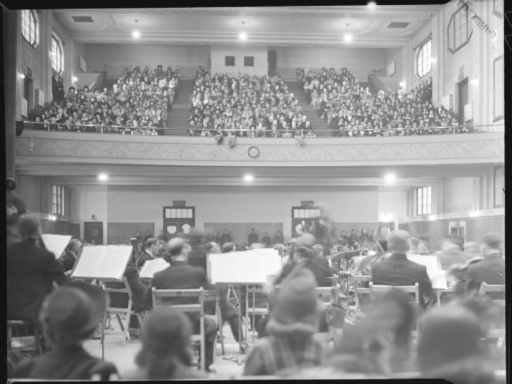 Le chef Wilfrid Pelletier dirige un orchestre à l'auditorium du Plateau situé au 3700, avenue Calixa-Lavallée à Montréal. Nous voyons le public assis au balcon pour écouter ce concert présenté dans le cadre des «Children's Symphony Concerts»