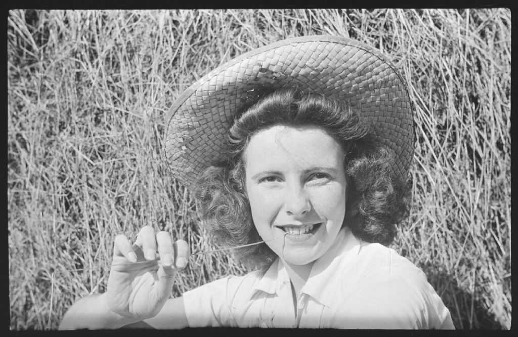 Nous voyons Eileen Greenwood coiffée d'un chapeau de paille et mordillant un brin d'herbe. Elle est assise contre une meule de foin