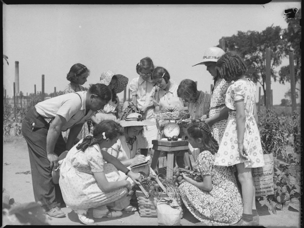 Des apprenties jardinières du Jardin botanique de Montréal font peser le fruit de leurs récoltes sur une balance. Mademoiselle Marcoux note les résultats dans un calepin devant Monsieur Guinois