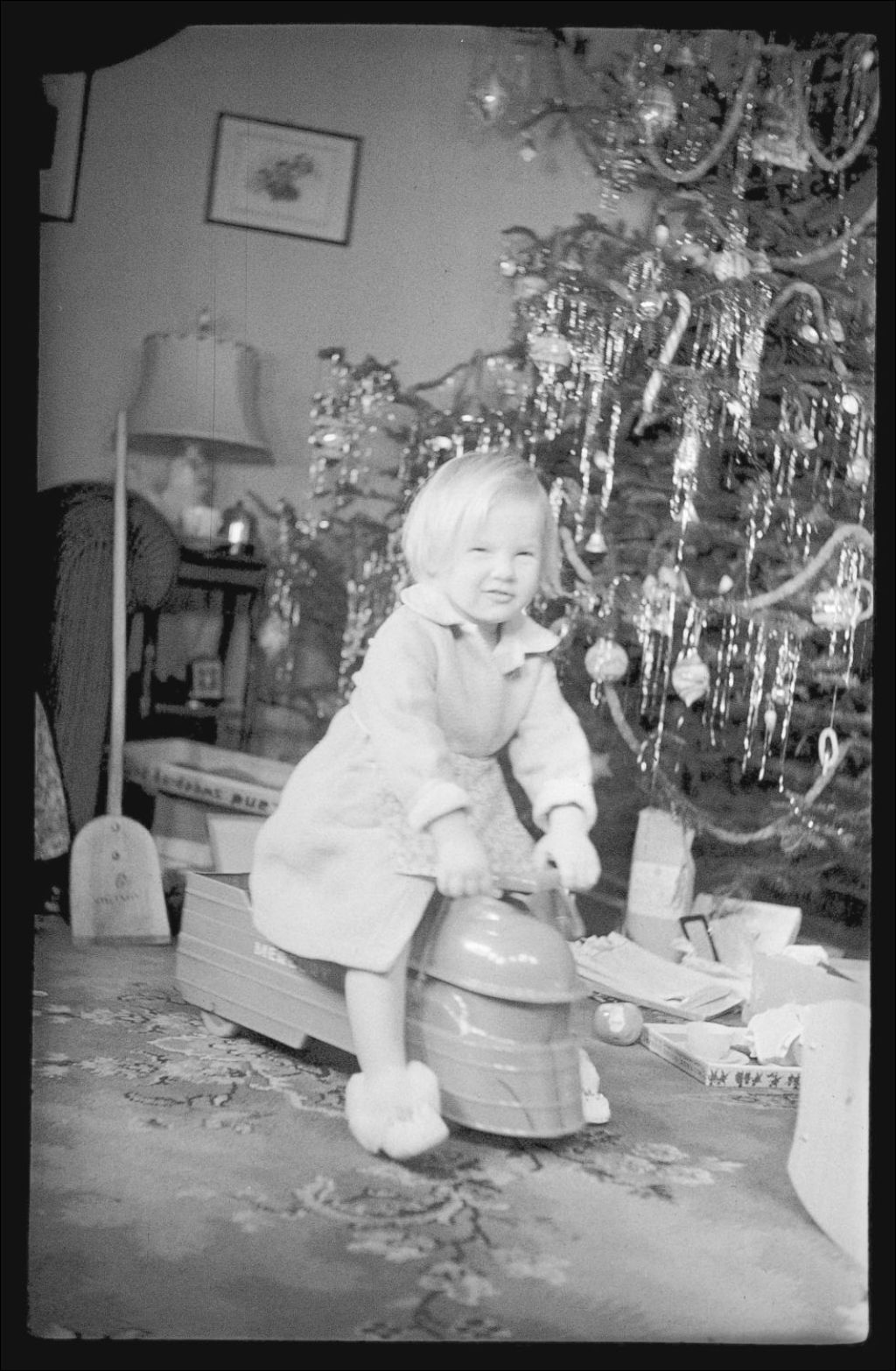 La petite Deanna Luck est assise sur son train sur roues «Mercury Flyer». Elle est à côté de l'arbre de Noël