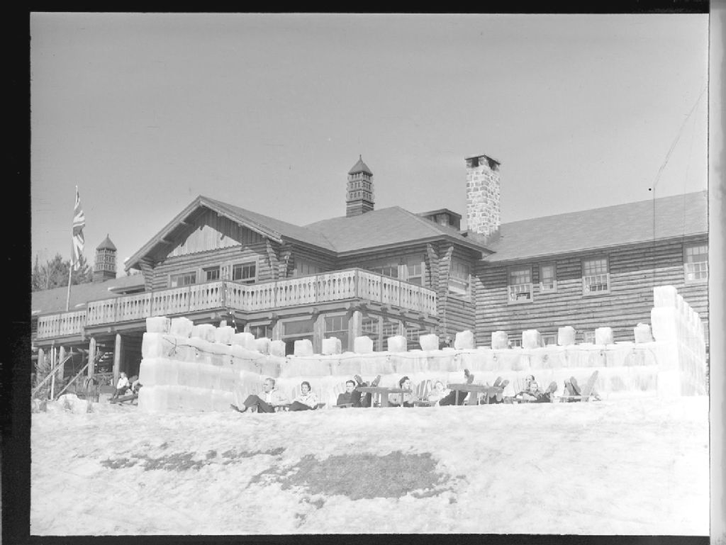 Nous voyons des vacanciers étendus sur des chaises installées devant l'hôtel «Alpine Inn» à Sainte-Marguerite-du-Lac-Masson dans les Laurentides. Ils sont protégés par un mur de château fort construit avec des blocs de glace