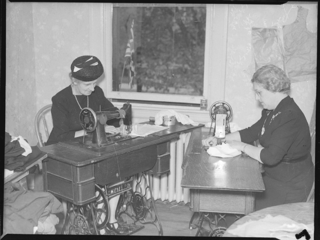 Deux femmes bénévoles, mesdames A. Paterson et D. Clarke, cousent des vêtements avec des machines à coudre dans un local situé au 4981, chemin Queen-Mary à Montréal. Ces vêtements vont être expédiés en Grande-Bretagne