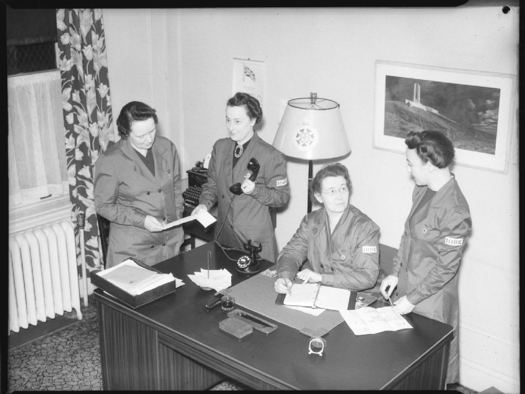 Quatre femmes bénévoles travaillent à l'administration d'un organisme de charité, le «Imperial Order Daughters of the Empire», dont le siège social est situé au 1455, rue Peel à Montréal. Nous remarquons qu'elles portent des brassards avec le sigle I.O.D.E. de l'organisme