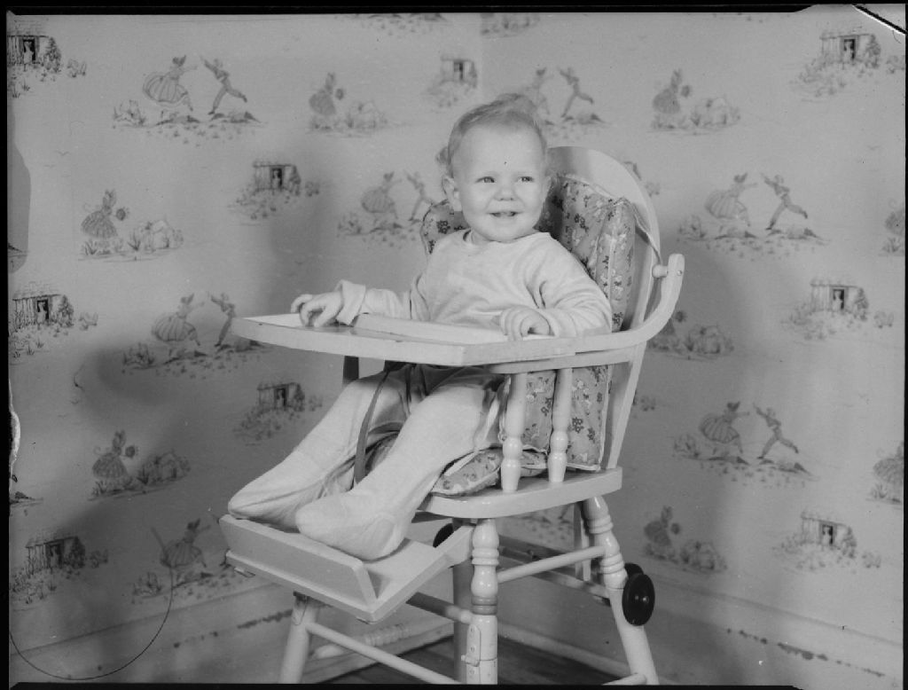 Sherrell Litchfield, nièce du docteur Patterson, est assise dans une chaise haute. Les murs de la pièce dans laquelle elle se trouve sont tapissés de papier peint à motifs