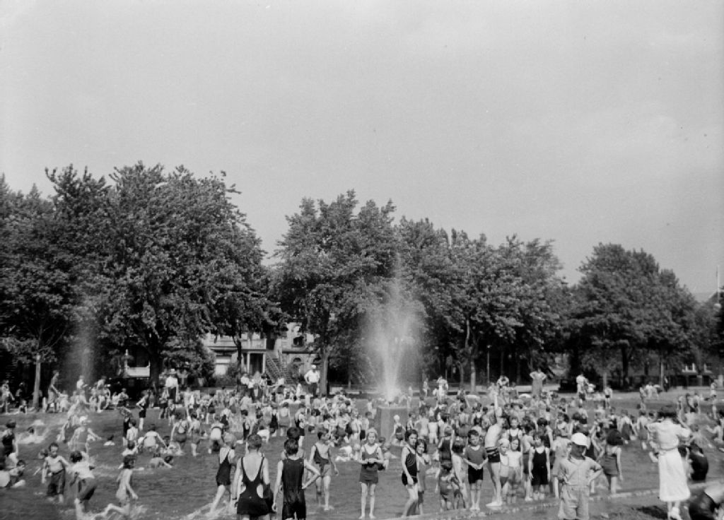 Foule des baigneurs assemblée dans un étang du Fletchers Field (Parc Jeanne-Mance) à Montréal. Nous y apercevons une fontaine et l'alignement des maisons en pierre et en brique le long de l'avenue de l'Esplanade à Montréal