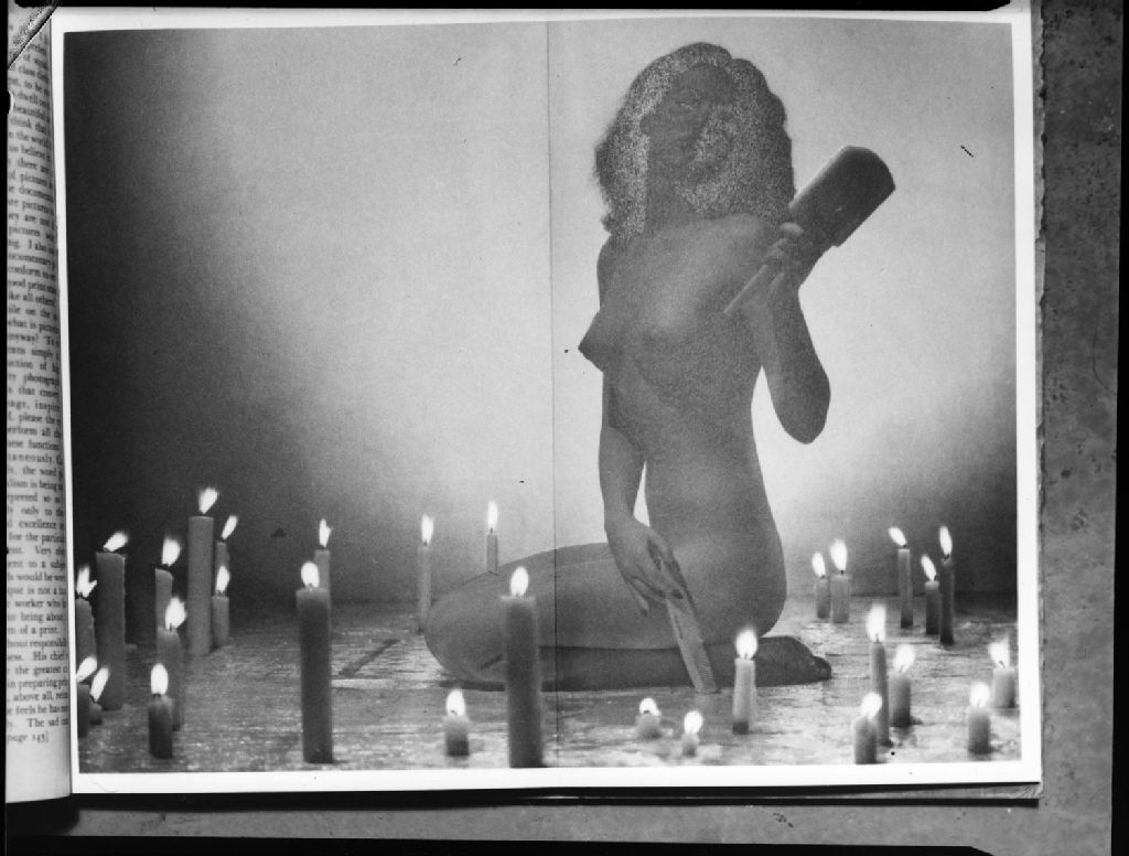 Nous voyons une photographie publiée dans une revue. Elle représente une femme nue, entourée de chandelles allumées, qui tient un peigne et une brosse
