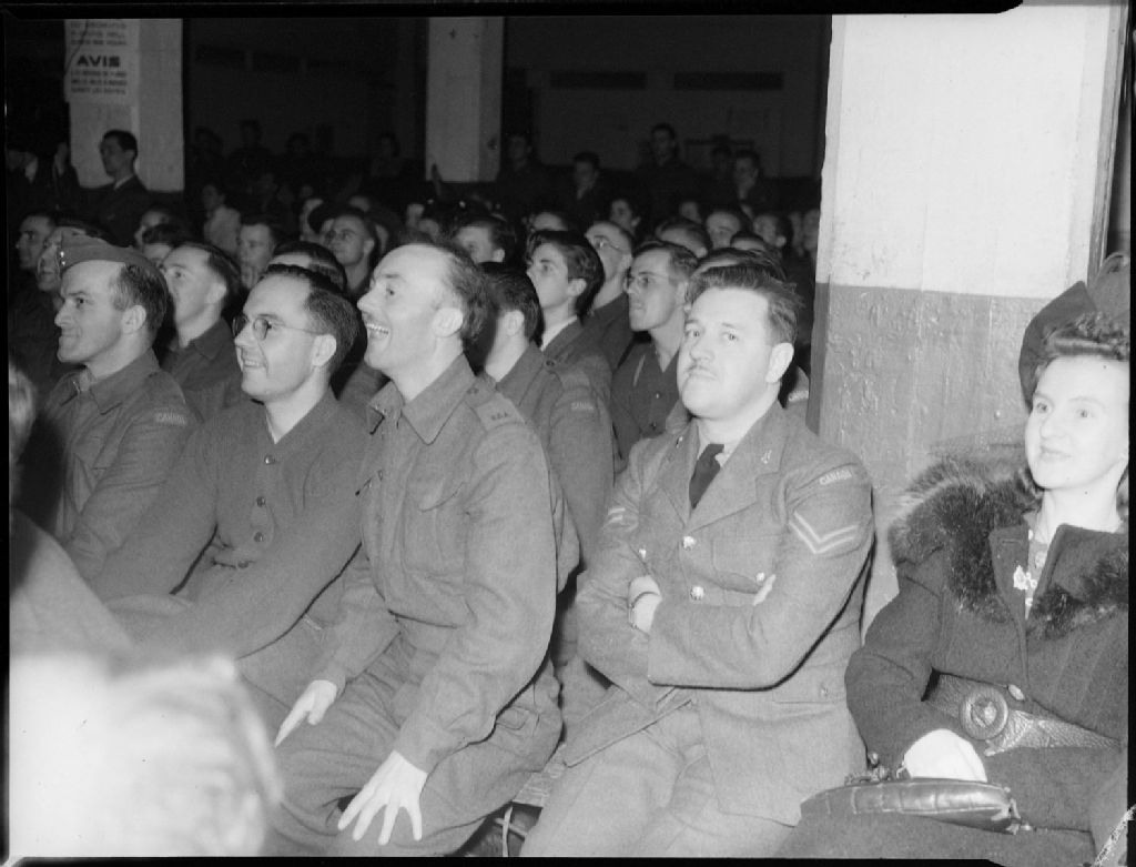 Des spectateurs, parmi lesquels nous remarquons des militaires, assistent à une représentation de la revue musicale «Thumbs Up» au «Motordrome Garage» situé au 312, rue Sherbrooke Est à Montréal