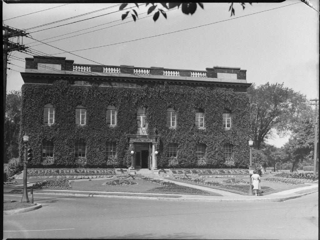 Nous voyons la façade couverte de lierre de l'hôtel de ville de Montréal-Ouest. Devant l'édifice des plates-bandes de fleurs forment la phrase : «Work for Victory. Let Us Be Free»