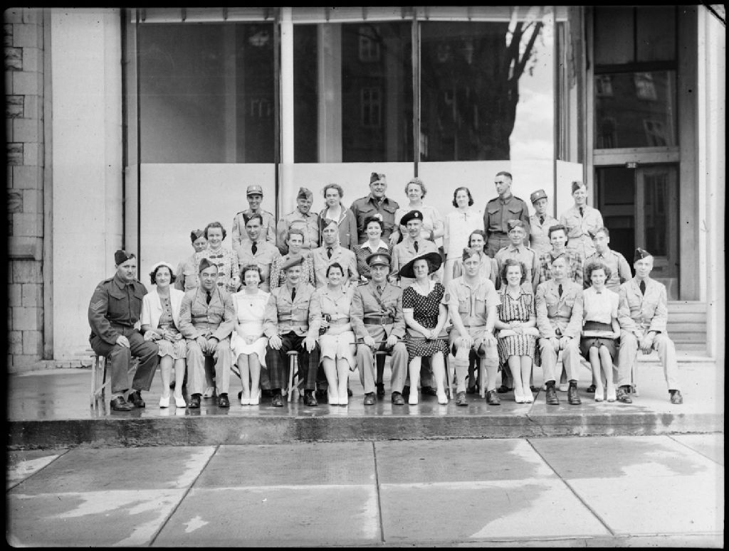 Des militaires et leurs compagnes sont réunis autour du sergent-major Bark. Ils sont devant le «Motordrome Garage» situé au 312, rue Sherbrooke Est à Montréal