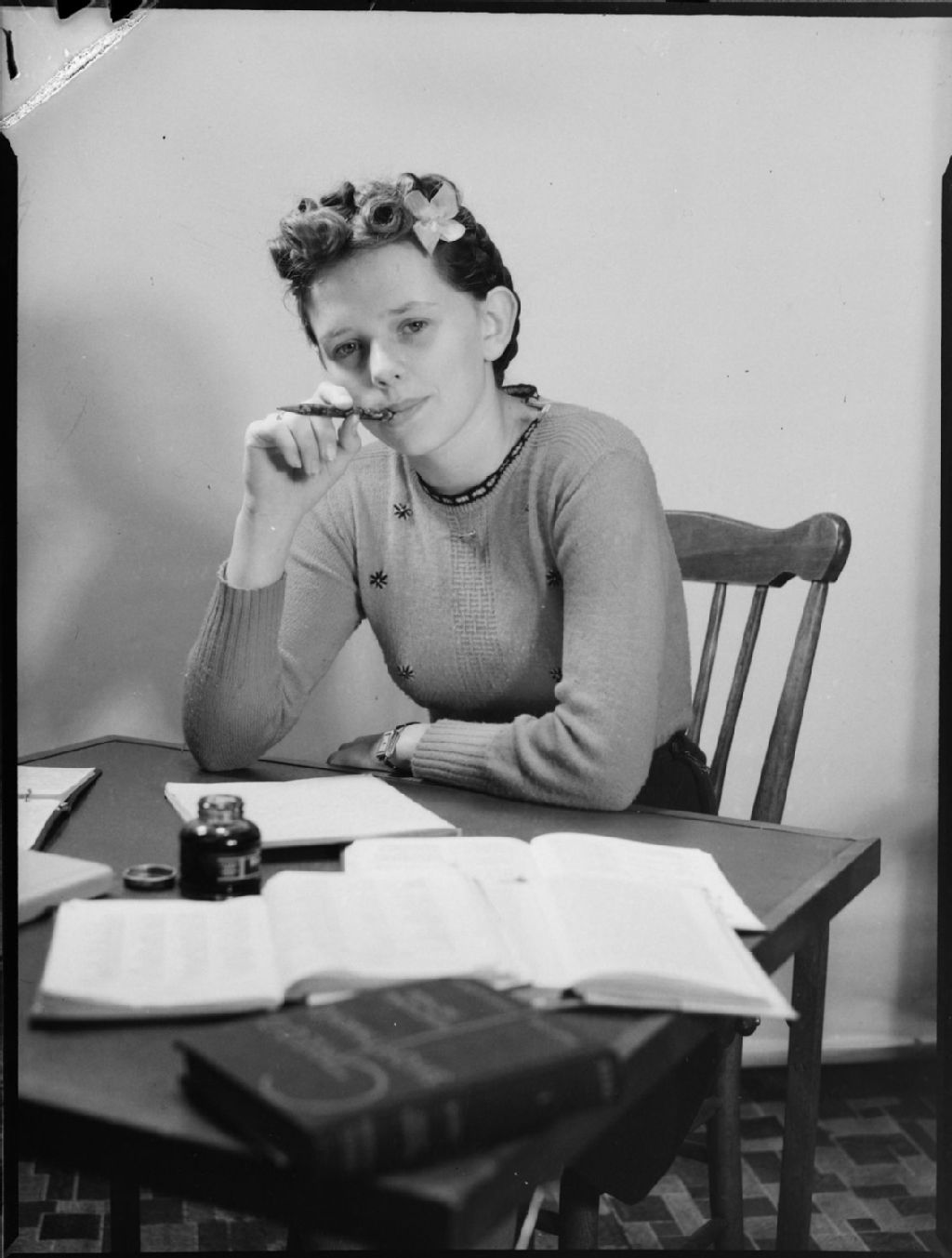 Margaret Findlay fait ses devoirs assise à une table
