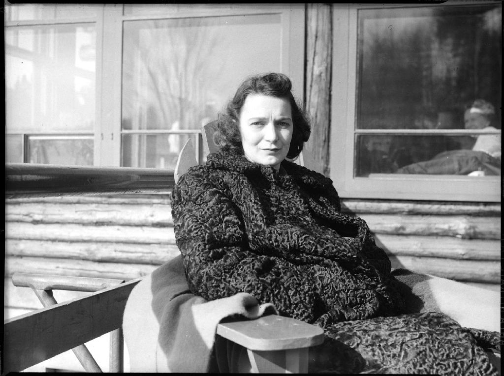 Marguerite Pelletier, en manteau de fourrure, est assise dans un fauteuil de jardin en bois devant l'hôtel Alpine Inn à Sainte-Marguerite-du-Lac-Masson dans les Laurentides