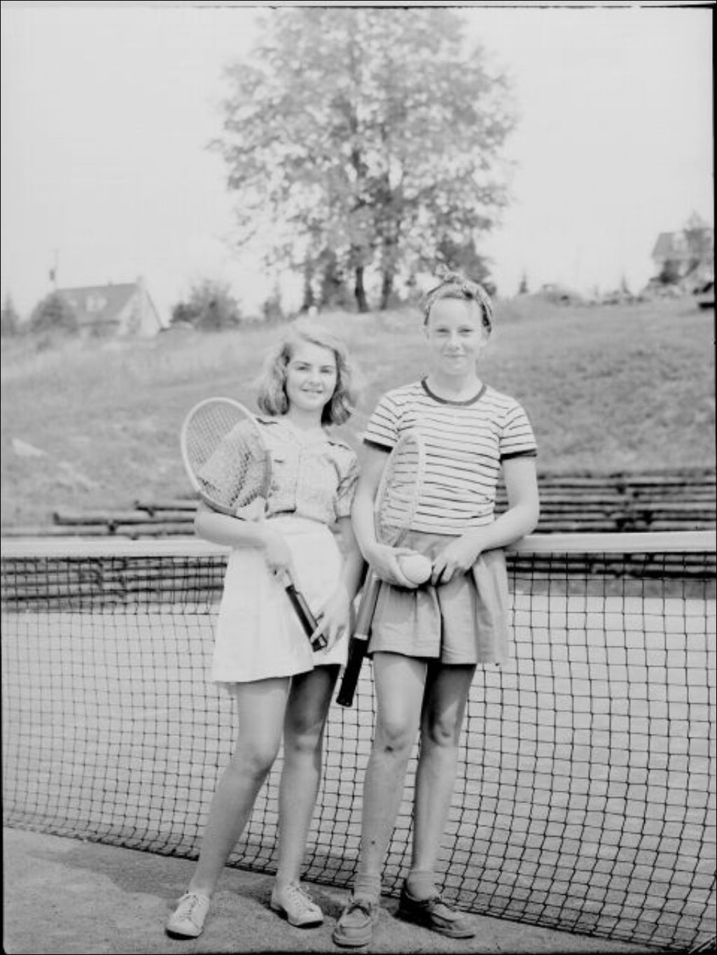 Denise Valois et Jeannine Desjardins, tenant leur raquette, sont debout près du filet d'un court de tennis de l'hôtel Le Chantecler à Sainte-Adèle dans les Laurentides