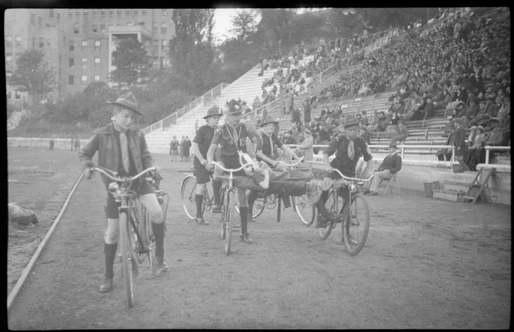Pause de la mi-temps au cours d'un match de football au stade Percival Molson de l'université McGill à Montréal. Des scouts paradent en bicyclettes