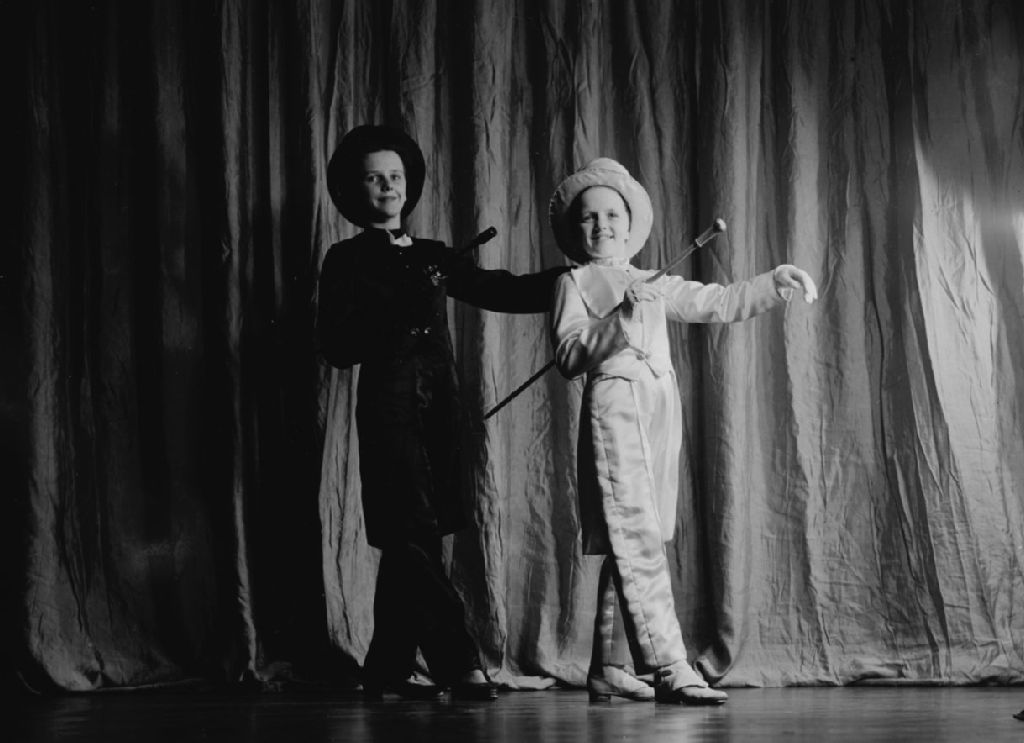 Helen et Margaret Findlay, en haut-de-forme et en queue de pie, font de la danse à claquettes sur la musique de la chanson «Me and My Shadow». Elles présentent ce numéro dans la revue musicale «Thumbs Up»