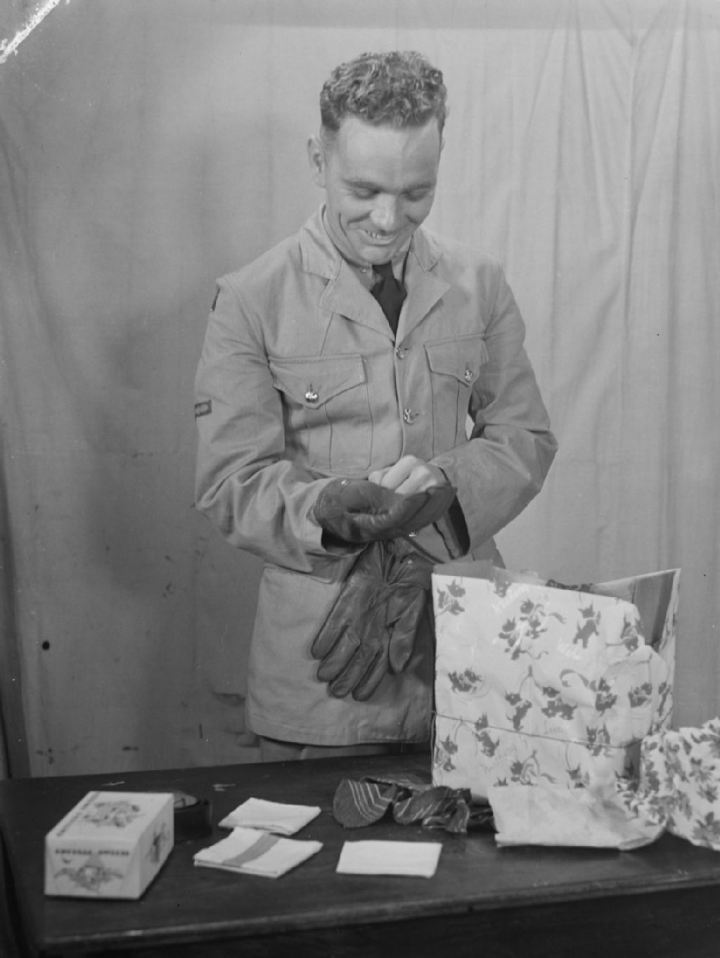 Un militaire essaye les gants qu'il vient de recevoir en cadeau de Noël
