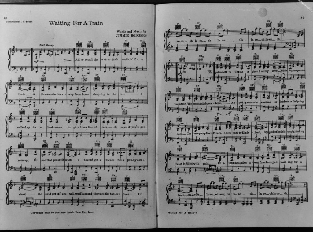 Nous voyons les pages 1 et 2 de la partition de la chanson «Waiting for a Train» de Jimmie Rodgers