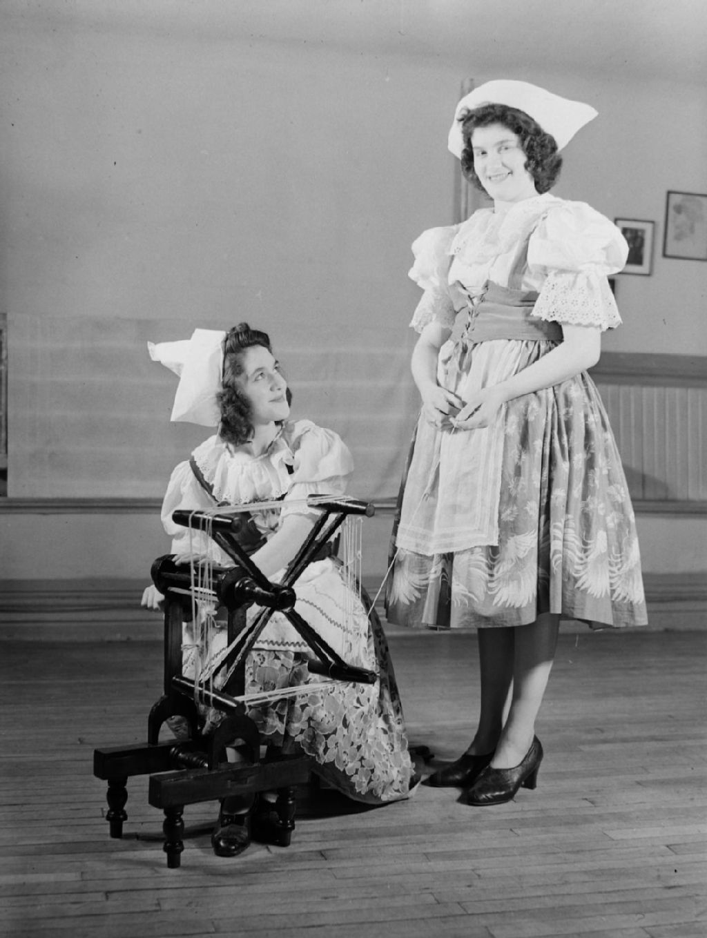 Gisèle et Simone Sabourin, en costume folklorique, font tourner un dévidoir pendant l'enregistrement de l'émission «Radio Petit Monde» diffusée par la station de radio C.K.A.C. de Montréal
