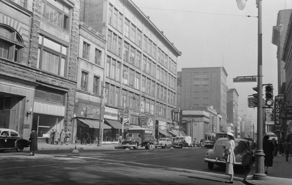 Nous voyons la rue Sainte-Catherine Ouest près de la rue de la Montagne à Montréal. Nous remarquons les magasins Marshall's et Kay's et le «Castle Building»
