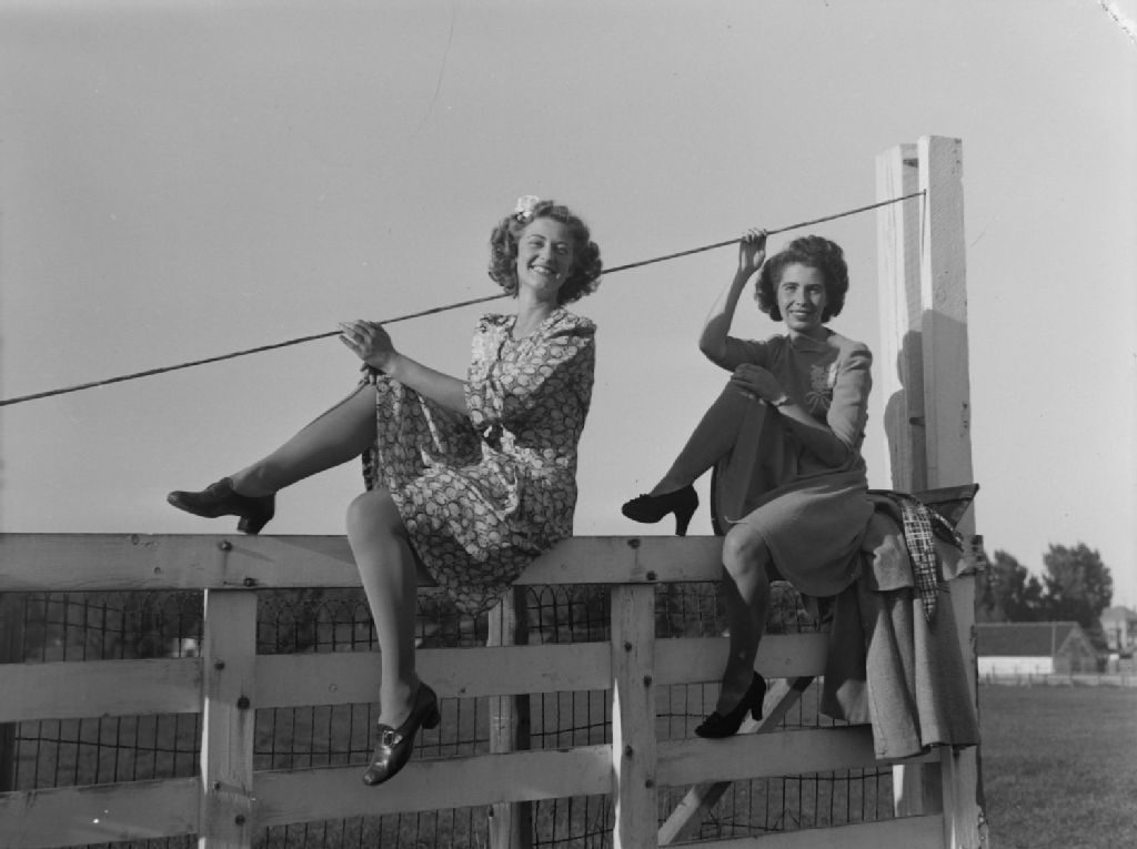 Inga et Marjorie [Aitken], deux membres de la troupe de la revue musicale «Thumbs Up», sont assises sur une clôture. Elles sont à Malone dans l'État de New York (États-Unis)