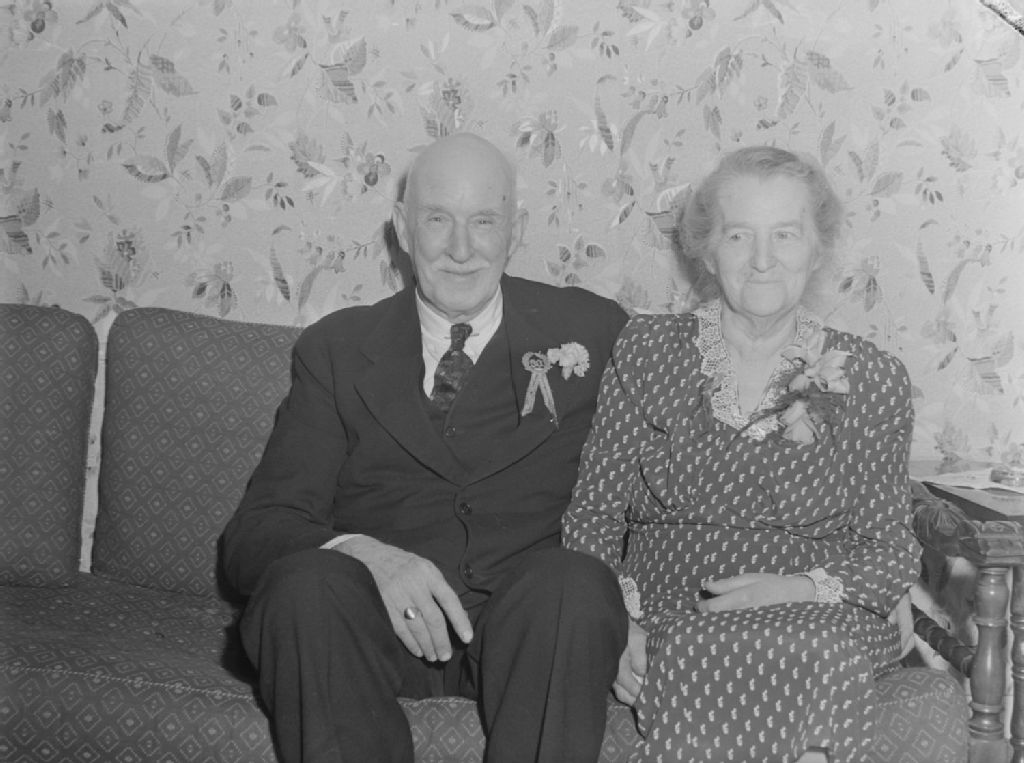 Madame et monsieur H. Glenfield célèbrent leur 50e anniversaire de mariage. Ils sont assis sur le canapé de leur résidence située au 3931, rue Joseph à Verdun