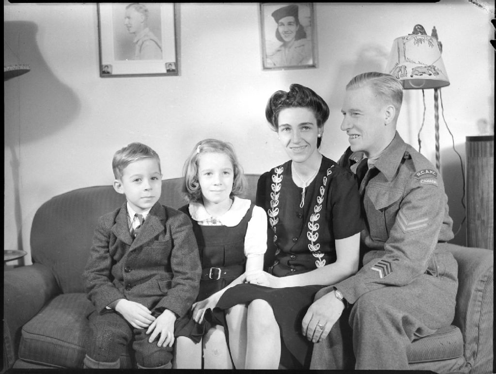 Nous voyons un soldat de l'armée canadienne avec sa femme et ses deux enfants