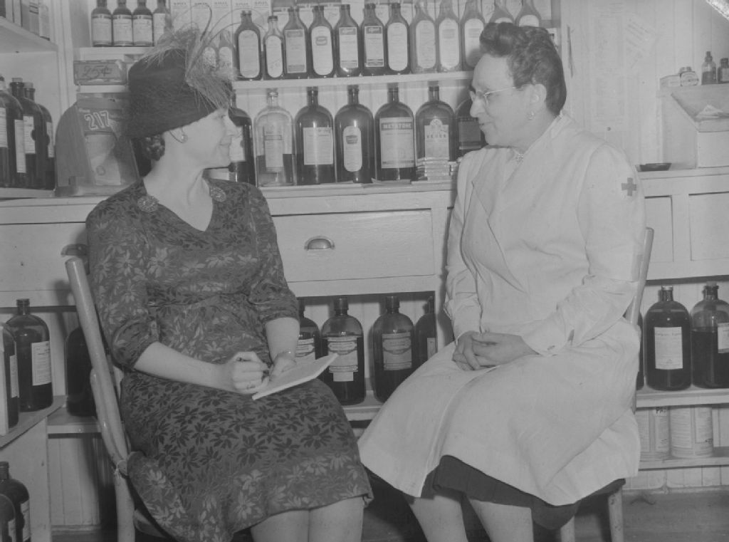 Madame Frigon, pharmacienne en sarrau, converse avec une cliente. Elles sont assises devant des tablettes pleines de bouteilles de produits pharmaceutiques