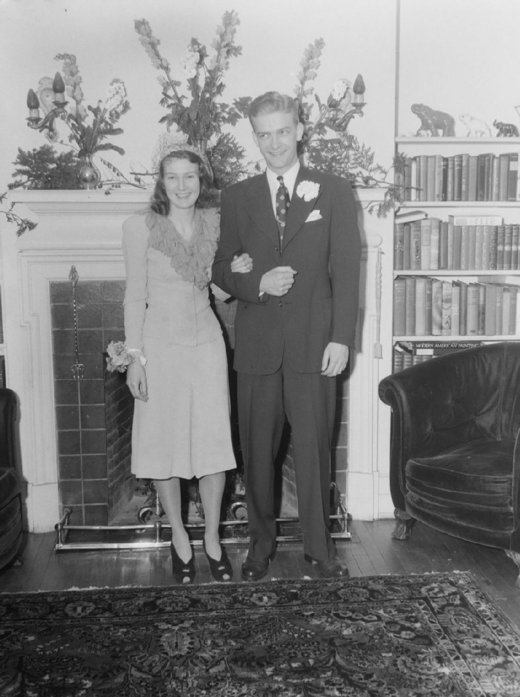 Nous voyons les nouveaux mariés, les Bickerdike-Smith, debout devant un foyer