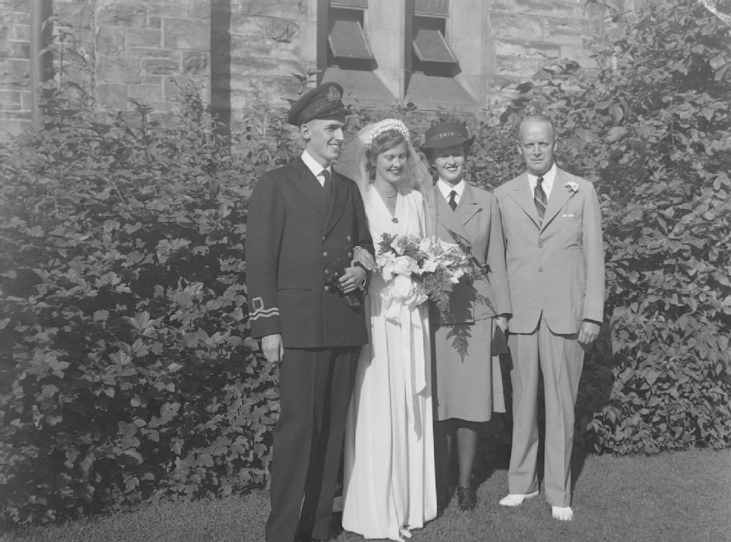 Nous voyons les nouveaux mariés, les Richardson-Rolland, avec les parents de la mariée, Madame et Monsieur Rolland. Le marié porte un uniforme d'officier de la Marine royale du Canada