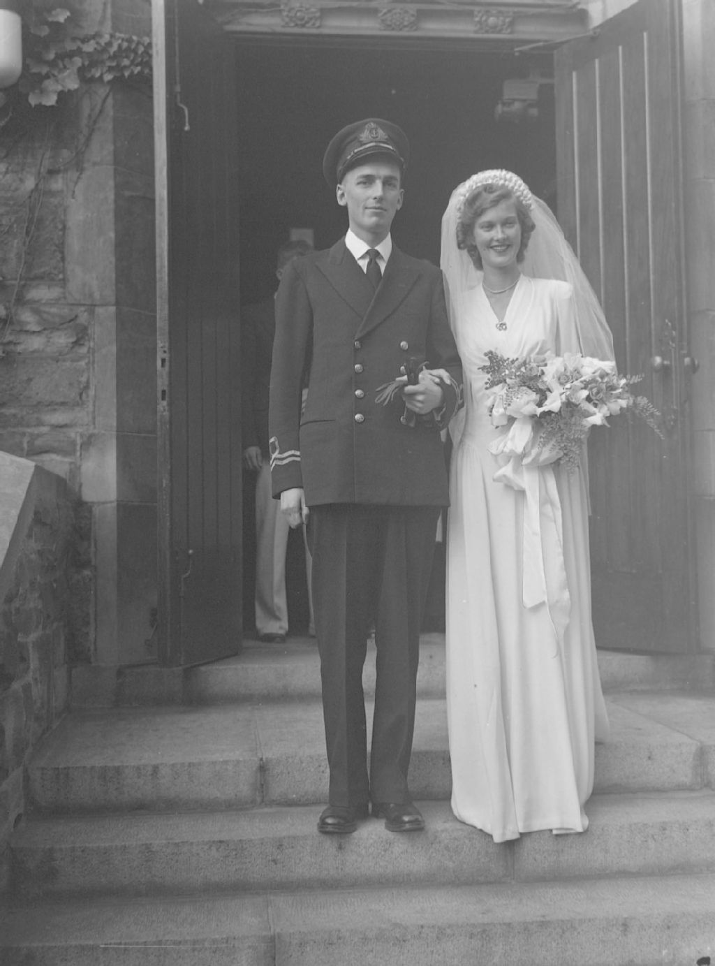 Nous voyons les nouveaux mariés, les Richardson-Rolland, sur le parvis de l'église. Le marié porte un uniforme d'officier de la Marine royale du Canada