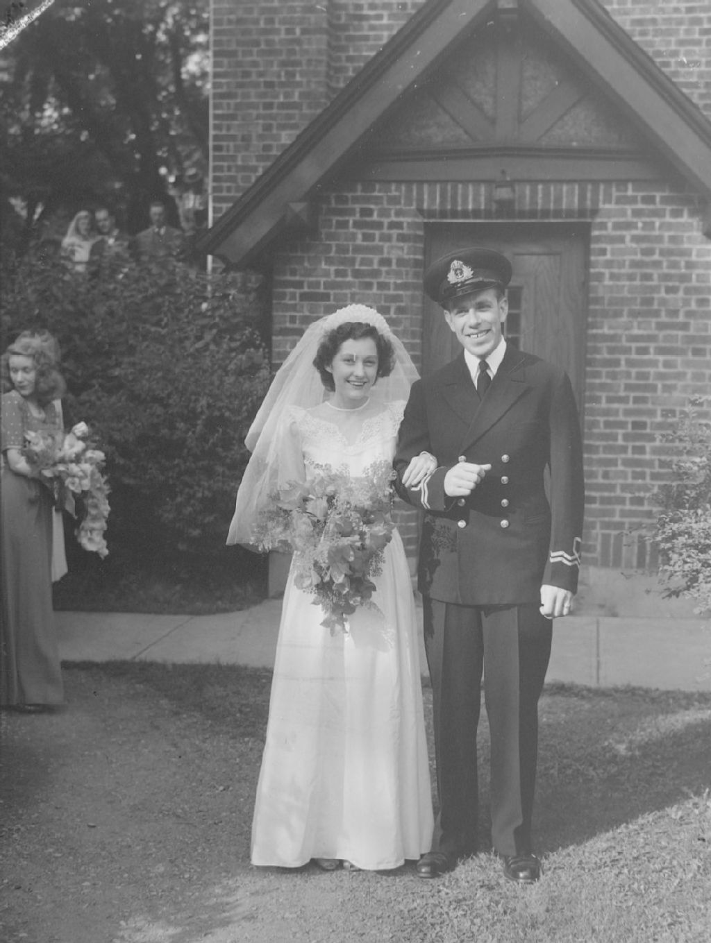 Nous voyons les nouveaux mariés, les Ewen-Margesson, devant un édifice en brique. Le marié porte un uniforme d'officier de la Marine royale du Canada