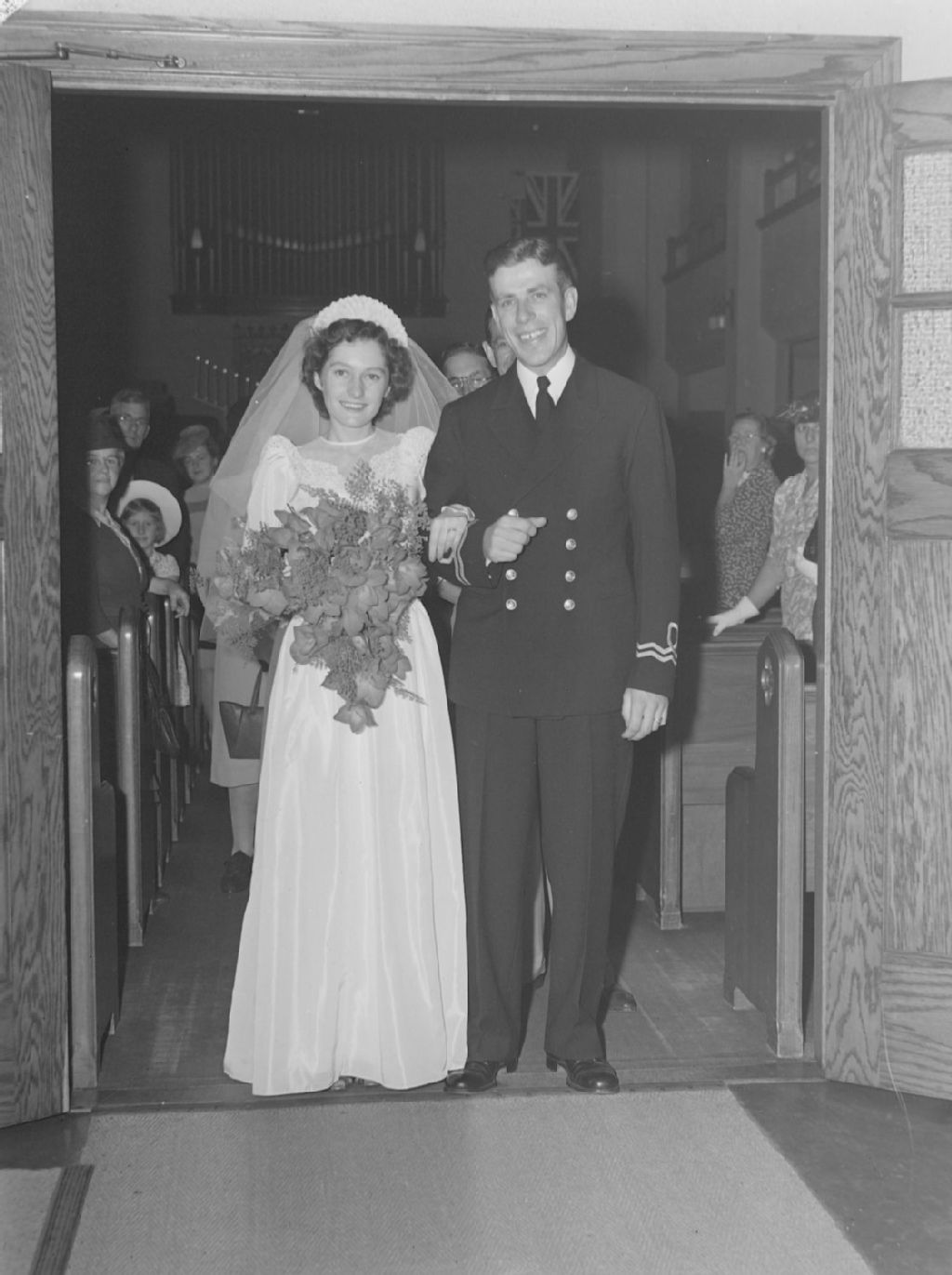 Les nouveaux mariés, les Ewen-Margesson, sortent de l'église après la célébration de leur mariage. Le marié porte un uniforme d'officier de la Marine royale du Canada