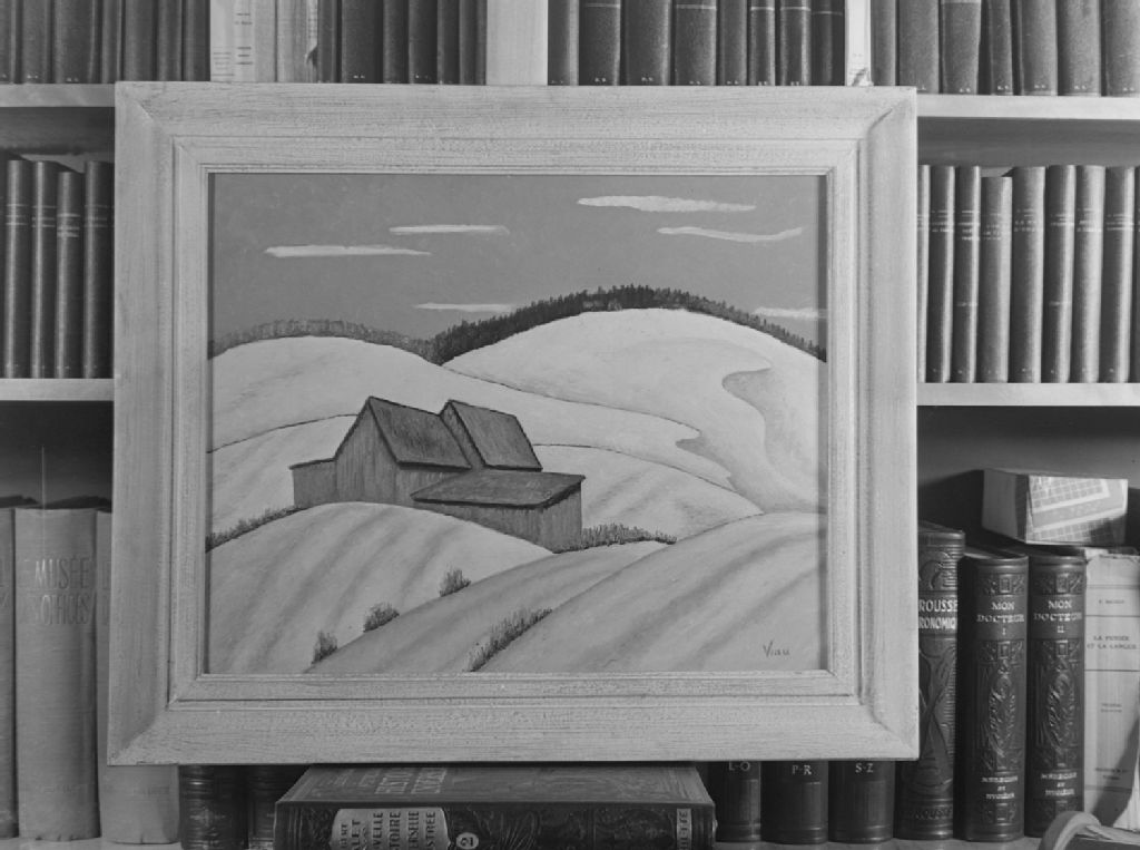 Nous voyons une toile représentant un paysage exécutée par l'artiste-peintre Roger Viau, élève d'Adrien Hébert