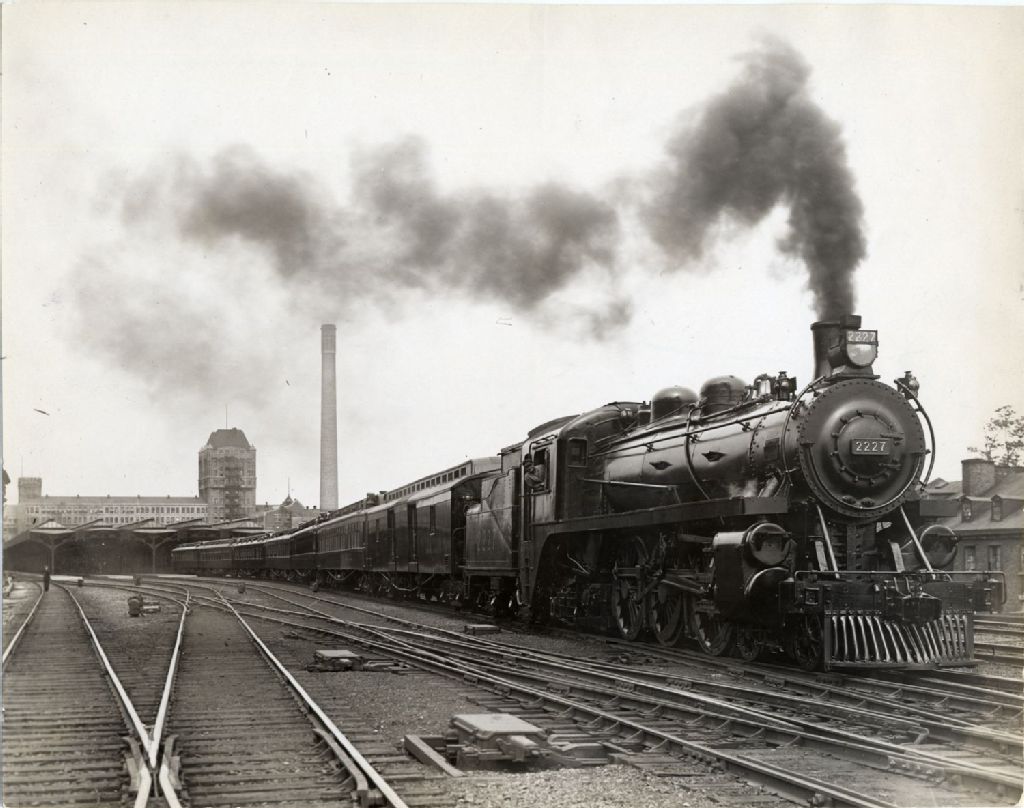 Train du Pacifique Canadien quittant la gare Windsor, [Vers 1930], Archives nationales à Québec, Fonds L'Action catholique, (03Q,P428,S3,SS1,D10,P30), C. P. R.